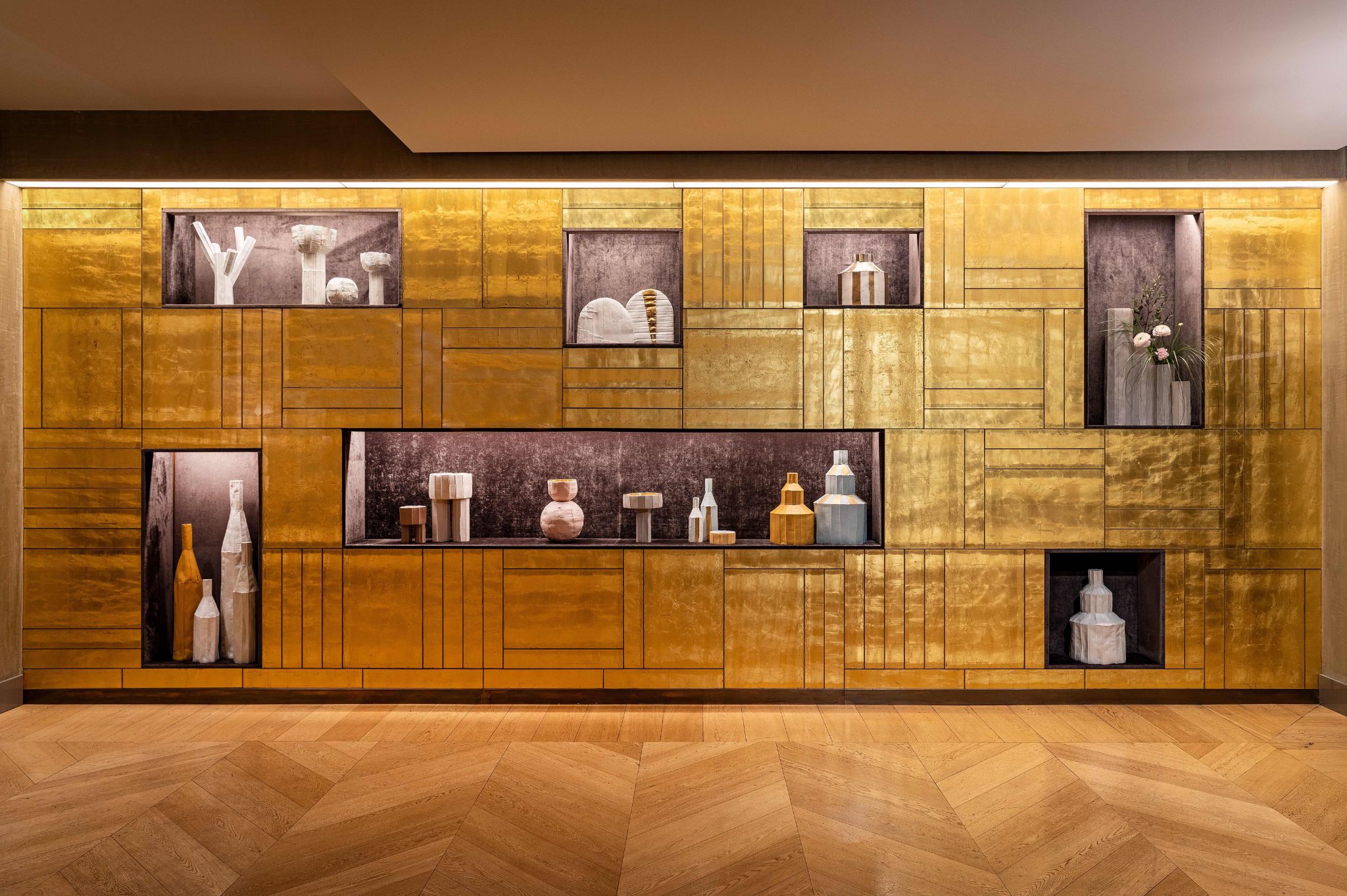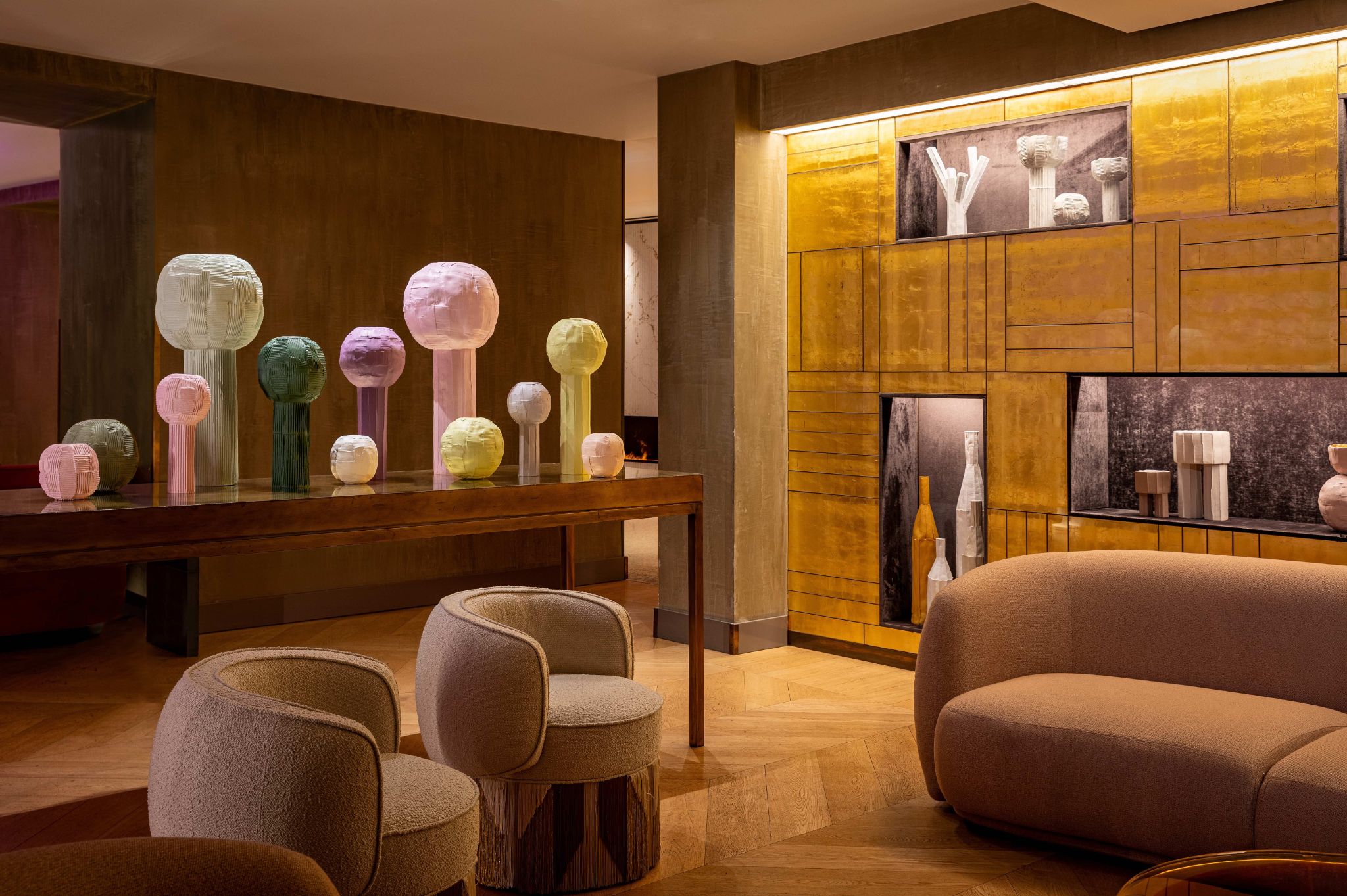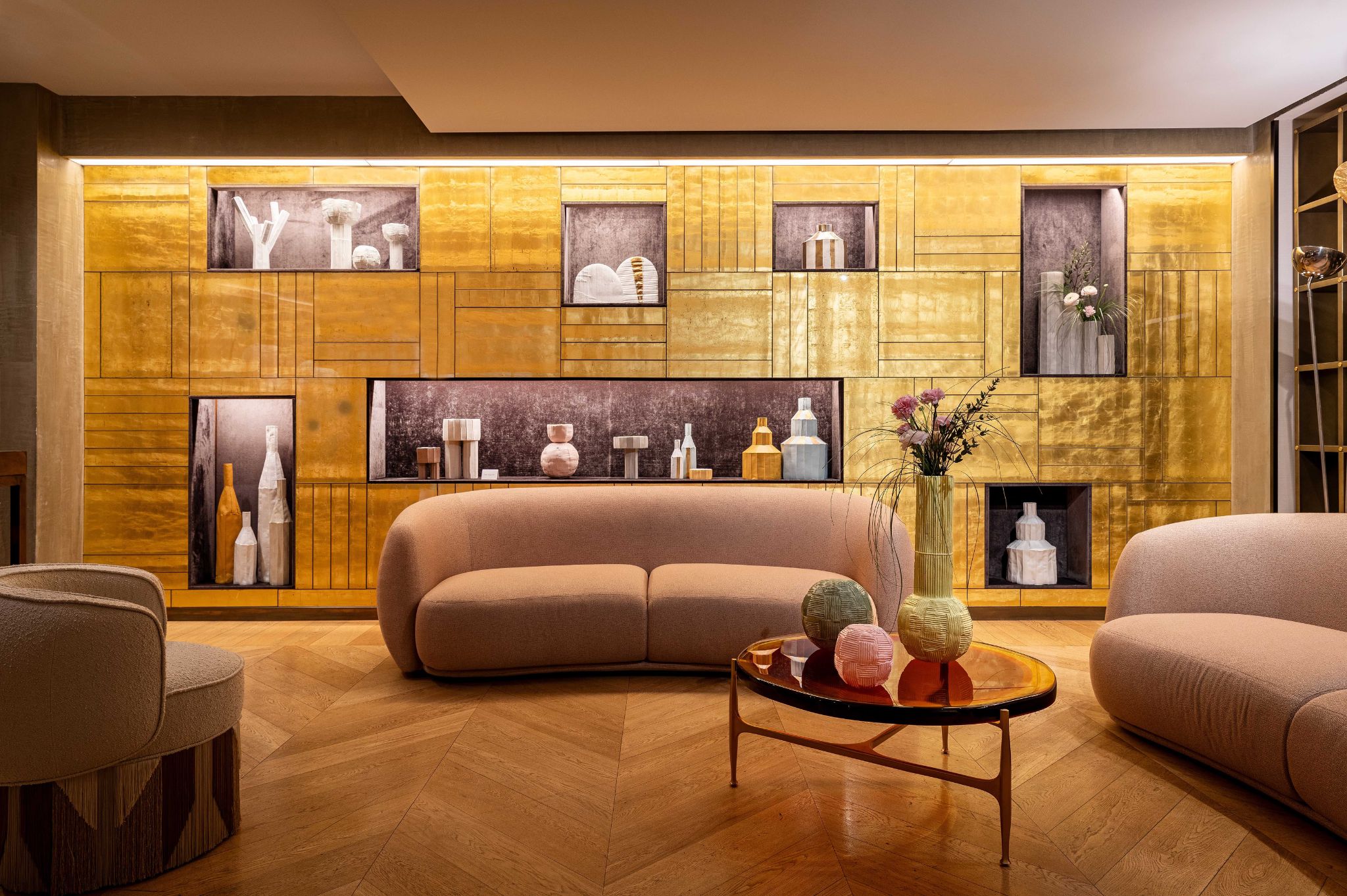 The main piece is accompanied by the creations Bulbo, which explores the harmony of essential forms in a soft and welcoming volume, and Trofeo, which celebrates the encounter between geometries and golden reflections.