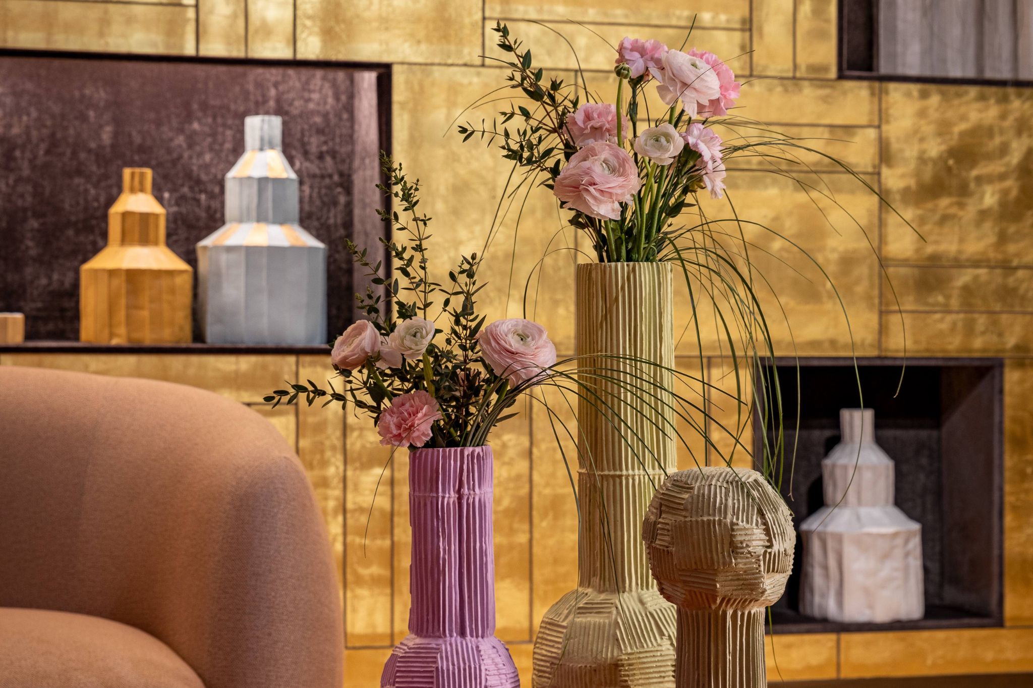 Completing the composition are the Fide vases, small ideal architectures, solid and silent, presented in pastel tones inspired by spring.
